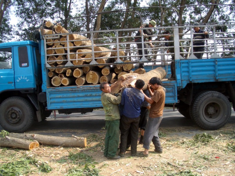 工人正在搬运刚刚被砍的树木