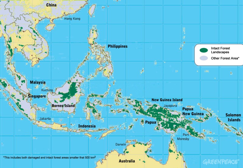 然而,天堂森林同时也是世界上毁林情况最为严重的地方。印度尼西亚和巴布亚新几内亚已经分别失去了72%和60%的大面积未被干扰的森林,而且存在着非常严重的非法采伐。该地区大部分木材都被直接出口到中国和日本,或经由中国企业加工后出口欧洲、美国和日本等消费国。