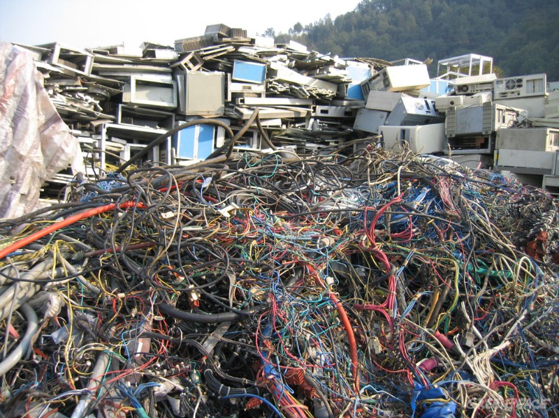 报废的成堆电线和电脑