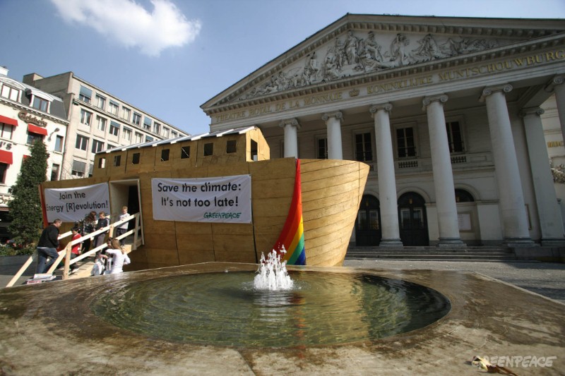 绿色和平在“IPCC”会议举办地布鲁塞尔市中心展示一艘“诺亚方舟”,呼吁各国政府立即采取行动,拯救气候。