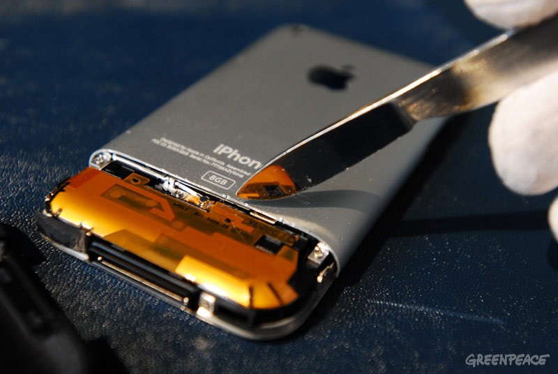 绿色和平还在分析中发现iPhone的电池没有采用通常的可拆卸方式,而是焊接粘贴到手机上的。这给更换电池带来了麻烦,也使分离回收、处理变得困难,更不用说增加了电子废物处理的负担。