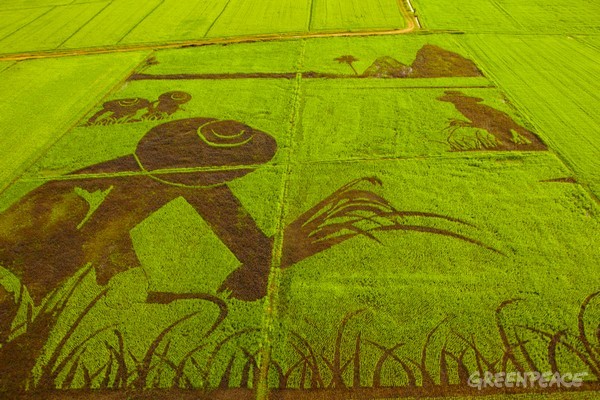 在泰国的Rachaburi,绿色和平揭开了巨幅有机稻作田间艺术的神秘面纱。这次的”稻作艺术”选用了两种叶片颜色不同的传统水稻品种(一种为绿色,另一种为黑色),采用有机的耕作方式,把它们种植在亚洲东南部最为富饶的水稻生产区域-泰国中部平原。”稻作艺术”的种植面积达16,000平方米,展现出农民头戴草帽用镰刀收获水稻的传统水稻耕作场景。