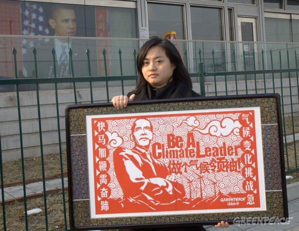 上个礼拜五,在奥巴马访华前两天,绿色和平气候与能源项目经理杨爱伦把这幅剪纸送到了美国驻中国大使馆官员手中,请他们作为拯救气候的礼物转交给奥巴马本人。