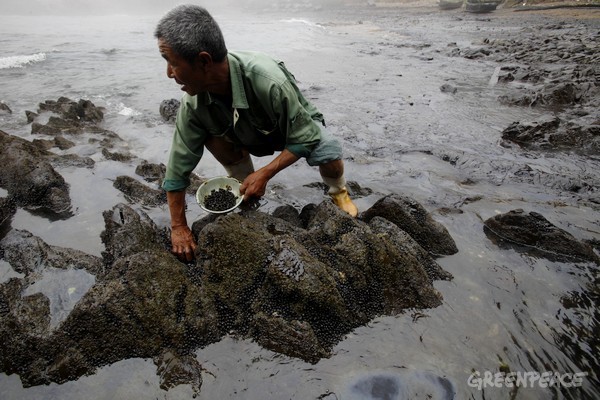 被称为”大连后花园”的金石滩国家旅���中心距离石油泄漏地点35公里,污染也已经扩散到这一地区,给海产养殖业造成严重影响。当地一万多家海产养殖户的贝类水产都已经遭受污染。其中一家养殖户近400亩的贝类养殖场由于石油入侵,其中部分贝类已经死亡,而在过去的六天里,贝类价格的批发价格也已经下跌了15%。”去年刚刚引进的贝苗也全部赔了进去,损失一共300多万”,这位姓吴的经营商告诉绿色和平。