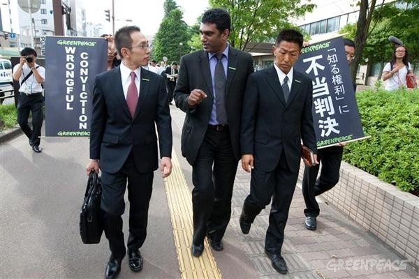 2010年9月6日,绿色和平日本行动者铃木彻和佐藤润一抵达青森法庭听取关于他们盗窃罪和非法侵入罪指控的最后审判。绿色和平日本同事打出了”绝不放弃知情权”的横幅。根据来自联合国非法拘留问题工作组最新舆论,日本当局在对待铃木和佐藤审判的问题上不仅违反了《国际人权宣言》,也违反了《公民权利与政治权利国际公约》,审判成为日本司法系统上的一个耻辱的标记。