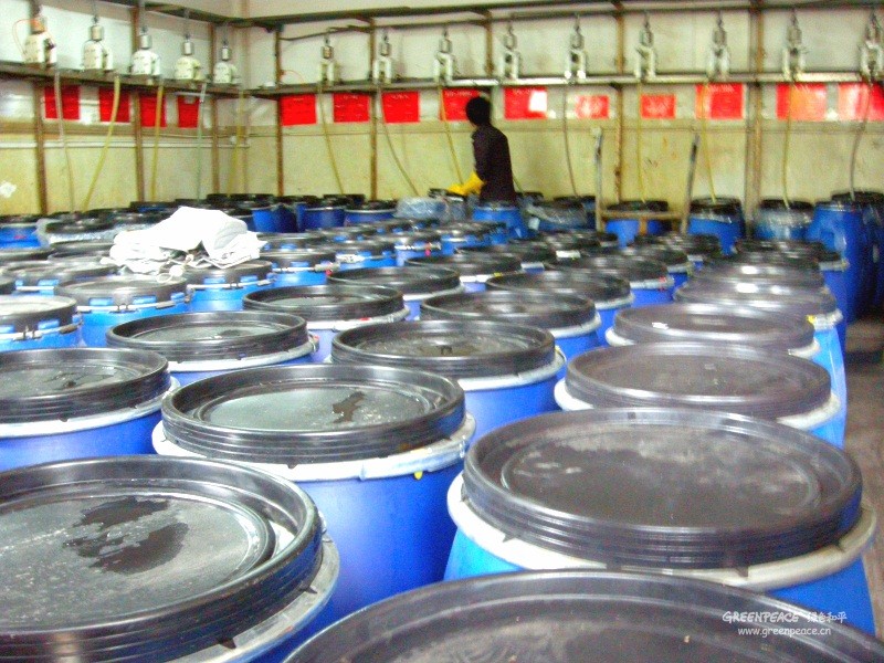纺织业中需使用大量的化学品,图为绿色和平暗访雅戈尔纺织工业城内部,化工桶堆积的场景。