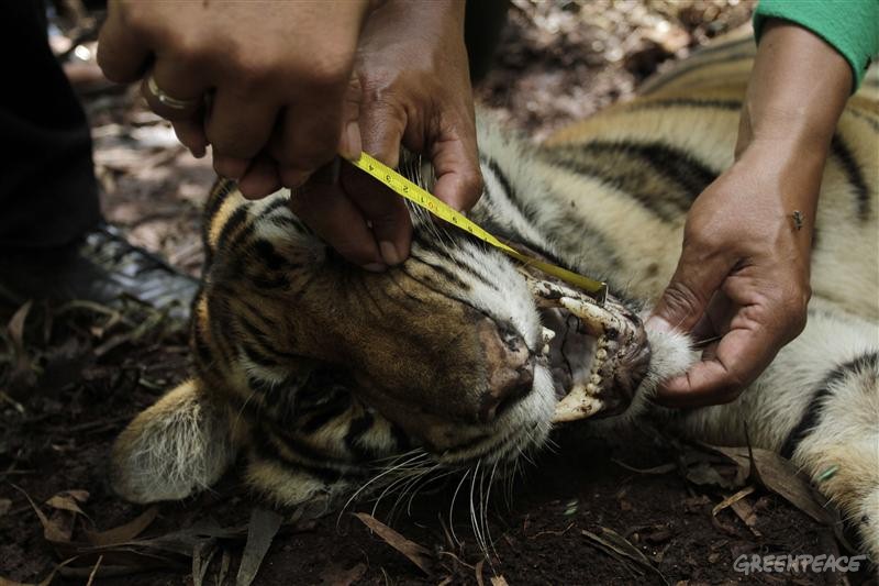 【相关背景】蚕食一切的绿洗公司 在痛苦中死去的苏门答腊虎:当地援救小组未能及时释放老虎并给予治疗,在接收麻醉不久后,老虎永远地闭上了眼睛。途中为森林管理员们测量老虎的牙齿以获取信息。绿色和平摄于2011年7月1日
