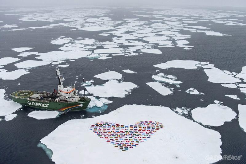 绿色和平的“极地曙光号”在北极圈内的漂浮海冰上构筑出一颗联合国193成员国国旗组成的“心”。心旗象征着一个团结一致的国际行动——保护北极。新近,科学家们发布了最新研究数据,指出北极海冰已经达到了自1979年有记录以来的历史最低点。 © Daniel Beltrá / Greenpeace