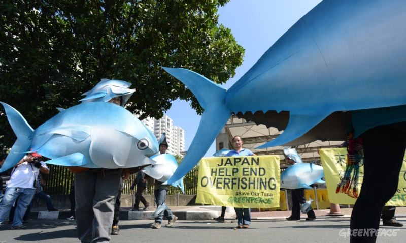 绿色和平在日本和韩国驻菲律宾使馆前敦促两国政府尽快结束金枪鱼的过度捕捞现状。
