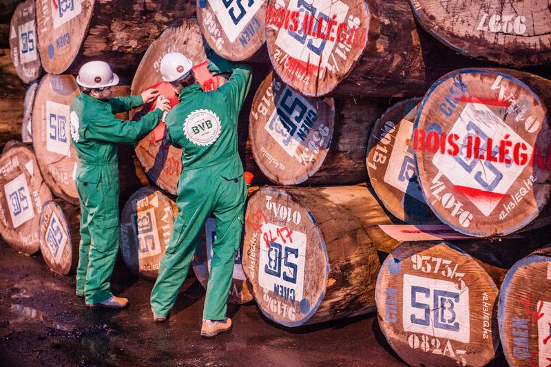 2014年1月8日,法国凯恩港口,绿色和平的行动者们发现了一艘来自刚果人民共和国(DRC)的非法木材运输船。绿色和平呼吁政府采取恰当的法律行动阻止非法木材贸易。