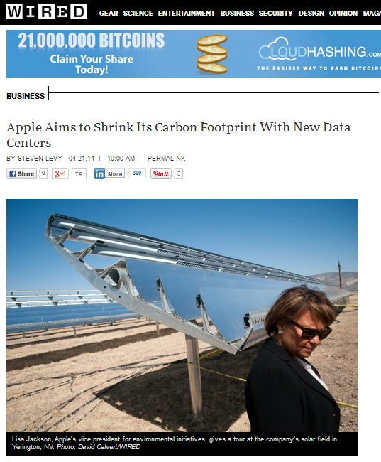 就在上个月(2014年4月),苹果公司高调宣布其将实现100%可再生能源供电数据中心,获得海内外高度关注。图为WIRED杂志(最知名的IT杂志之一)对苹果公司的独家封面报道。