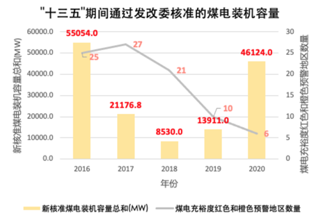 2016年至2020年通过发改委核准的煤电装机总量变化趋势以及国家能源局在2016年至2020年每年发布的煤电装机充裕度预警为红色和橙色的地区数量变化。制图:绿色和平