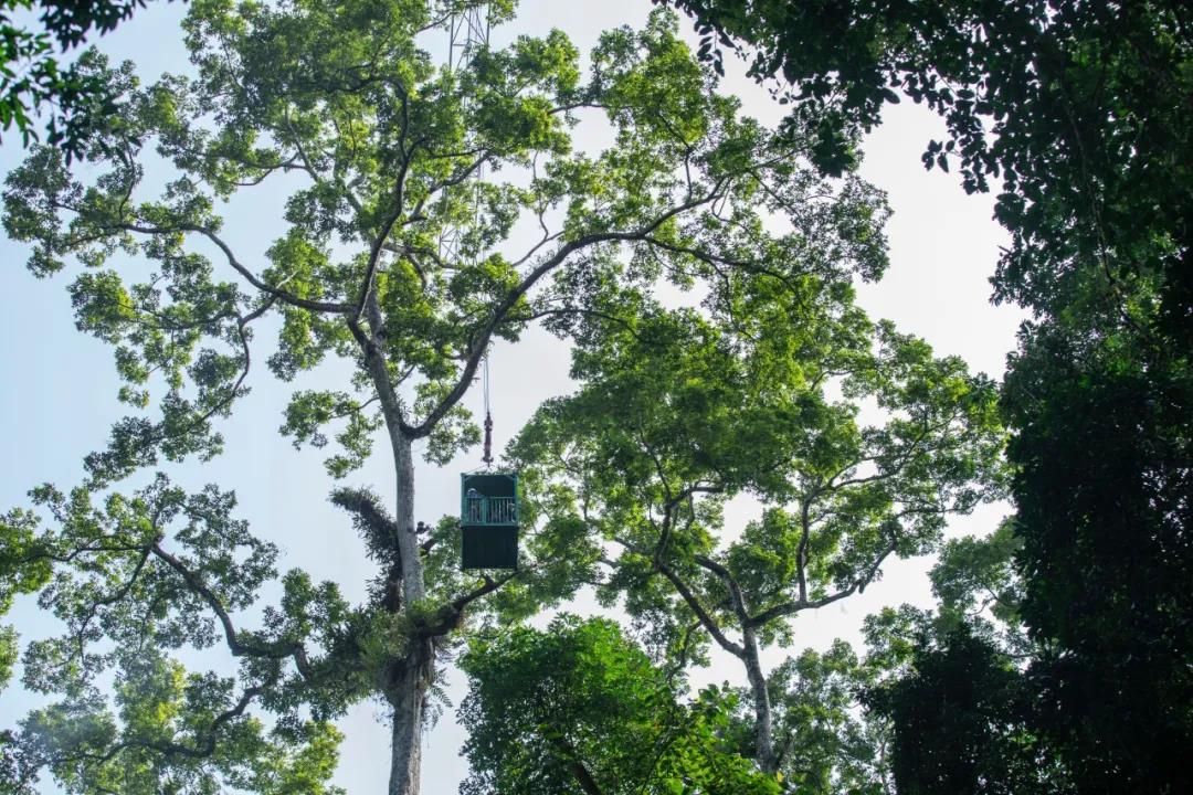 我们身处中国科学院西双版纳热带植物园的望天树热带森林样地里,这里矗立着世界第一高的林冠研究塔吊,高度80米。人在这个庞然大物面前顿时缩小了。等着塔吊升起,童真会快速回到每个人的脸上。看,被巨人托在手心,在深绿的波浪起伏中遨游,你可以选择靠近那个长满各种附生植物的树杈,探索一个树洞、一个树丫里都可能形成的一个个微型生态系统,也能让这股温柔而强大的力量把你一下提到空中,从高处俯瞰植物的海洋……被庞大的塔吊带着,和植物做了一次隐秘又刺激的互动,回到地面,所有人都大呼过瘾。
