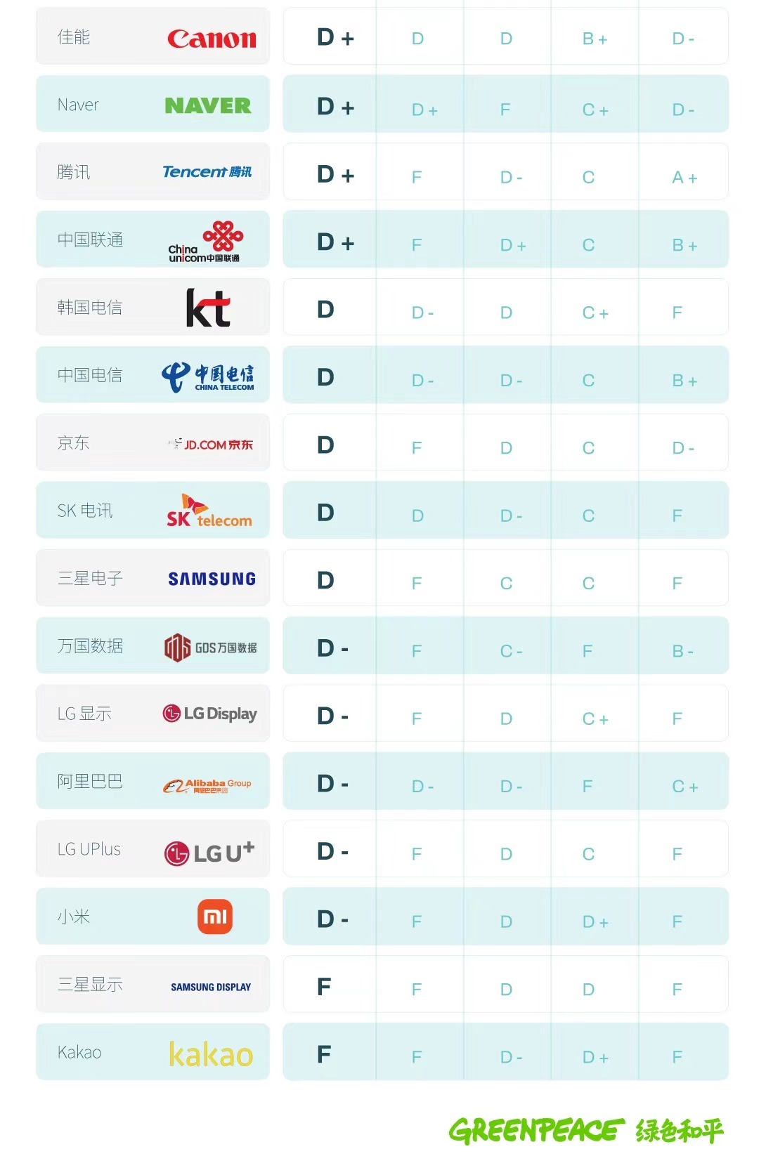 2021年12月2日,北京——国际环保机构绿色和平今日发布《逐绿而行:中、日、韩科技企业气候行动研究报告》(下称报告)对东亚地区30家头部科技企业进行评级。报告发现,上榜科技企业整体仍然缺乏有力的气候行动。其中,全球知名消费电子产品制造商三星电子、小米尚未作出全球范围内的100%可再生能源及碳中和承诺,导致排名落后。对此,绿色和平呼吁东亚科技行业应在碳中和时代下充分发挥创新领导力,及早制定在2030年前实现包含供应链在内的100%可再生能源的目标,切实履行气候承诺。