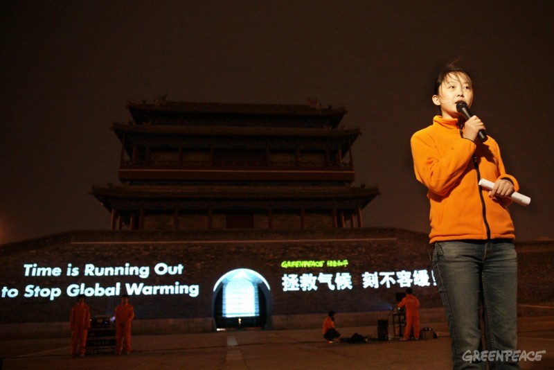 绿色和平将北京的永定门城墙面变成了倒计时钟。随着”拯救气候,刻不容缓”的倒计时,绿色和平同时展示了全球变暖正在对于中国产生的影响:暴雪、台风、洪涝、旱灾等极端天气,以及正在急速消融的西部冰川。未来二十至三十年内,中国还将面临因变暖带来的水资源短缺和粮食危机等严峻挑战。